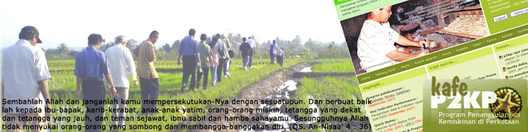Foto background banner, itu foto koleksi sendiri. Yaitu, waktu liputan ke Sukabumi, Juni 2006 lalu. Mudah-mudahan ngepas sama motto P2KP yang “bersama menuju kemandirian”, meski jalannya setapak demi setapak. Yang penting kan, semangat kebersamaannya, ya nggak?