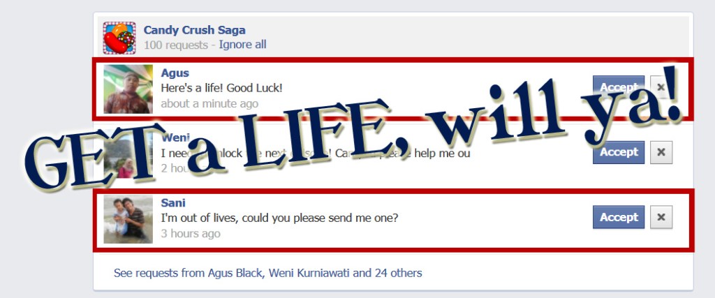 When you’re nosing around–stalking–some other people’s lives a little too much, they might get angry and shout at you, “Get a life, will ya!” When that happened to you, go play candy crush saga. There, each of your friend will get you a life, and sometimes they will ask you a life as well.