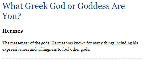 But there was another link for the similar quiz on a different site (sorry, I can’t remember the site’s URL, and the history of my chrome is instantly erased once I logged out the browser). So, I clicked it and took the test. Guess what….. In that other quiz, I am Hermes: The messenger of the gods, Hermes was known for many things including his expressiveness and willingness to fool other gods.