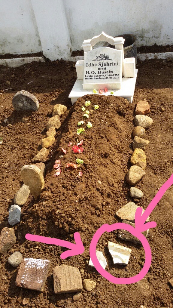 Sekira pukul 8 tadi, saya, Tante Iyam dan Naufal Fadhilan Rizq ke makam mama, krn kemarin sudah janjian sama ustadz yang mengurusi makam mama untuk merapikannya. Sesampai di sana, ternyata makam sudah dirapikan. Kelebihan tanahnya sudah disingkirkan. Sambil menunggu ustadz datang, Tante saya dan balitanya (Naufal) mampir ke rumah sang ustadz, tidak jauh dari makam. Sementara itu saya ambil beberapa bongkah batu yang bertebaran di sekitar makam mama guna ditaruh di sekeliling makam mama. Baru beberapa balik saya mengambil dan menaruh batu. Kira-kira kali ke-3 saya membawa batu untuk diletakkan ke posisi agak ke bawah (bagian kaki makam) saya tertegun sambil terus melihat ke sepotong ubin berwarna, yang tergeletak di kanan bawah (saya lingkari). Ubin itu bersih. Saya heran, siapa yang menaruh di situ? Saya ngga mengambil ubin tersebut, apalagi meletakkannya di situ. Dan di makam itu saya hanya sendirian.