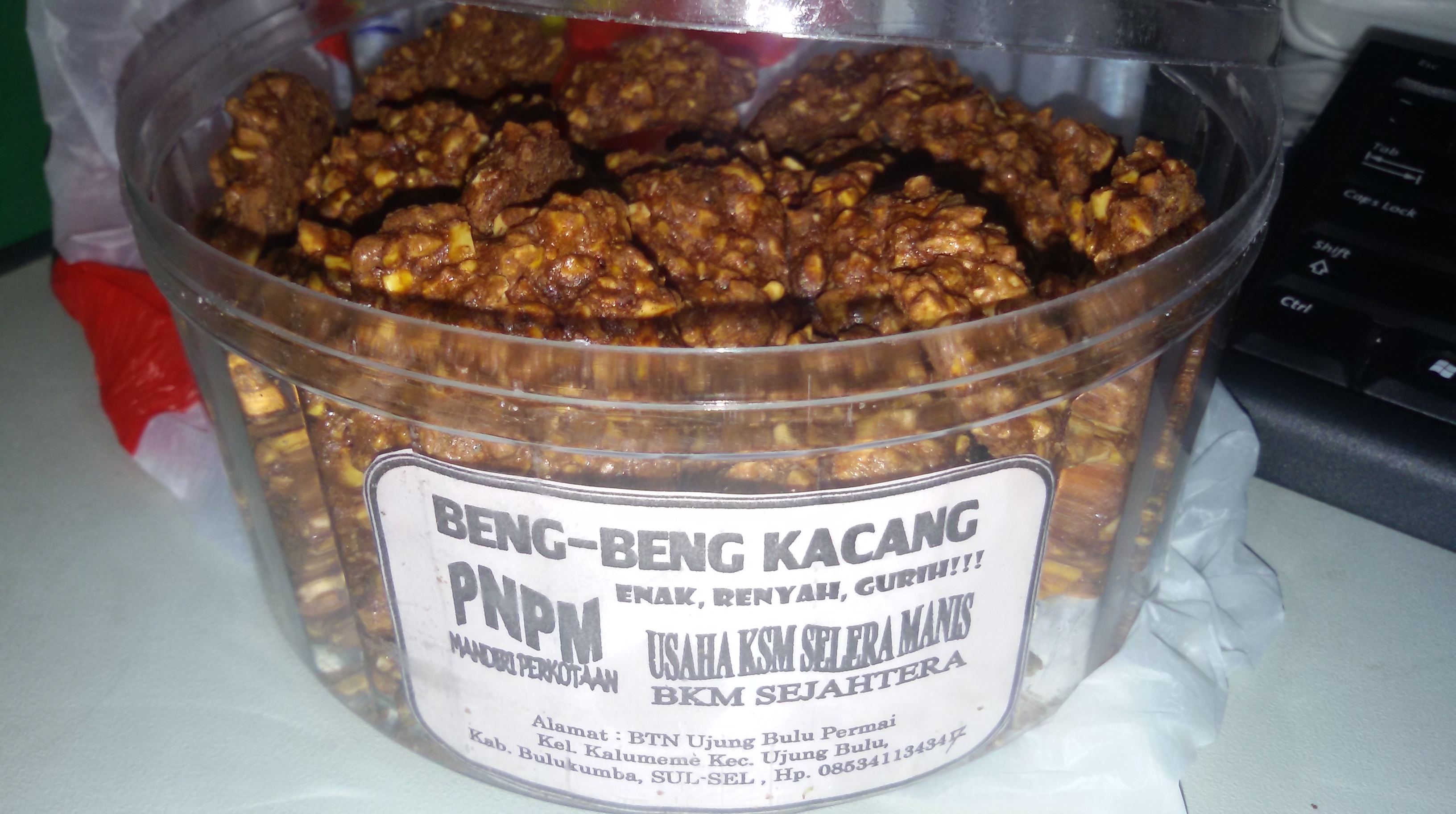 Beng-beng kacang, namanya. Produksi Kelompok Swadaya Masyarakat (KSM) Selera Manis, binaan Badan Keswadayaan Masyarakat (BKM) Sejahtera, Kelurahan Kalumeme, Kecamatan Ujung Bulu, Kabupaten Bulukumba. Bagaimana saya bisa mendapatkan cemilan dari lokasi sejauh itu?