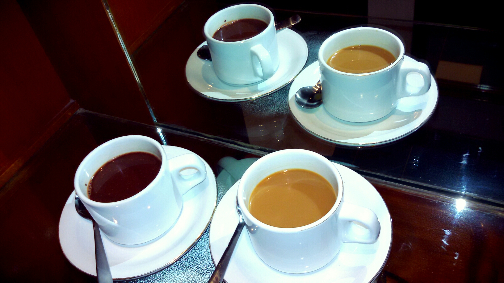 Seperti sarapan pagiku ini. Segelas cokelat hangat dan kopi ber-krim. Hanya dua gelas, tapi terlihat empat, karena saya letakkan mereka di depan cermin. 😄😉