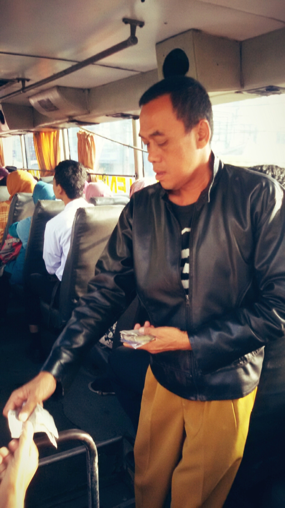 Inget cerita saya soal bus mogok dan Pak Polisi Suryadi dulu itu? Nah ini dia Abang kondektur ramah yang ngobrol dengan saya waktu itu. Nama beliau Hakim.