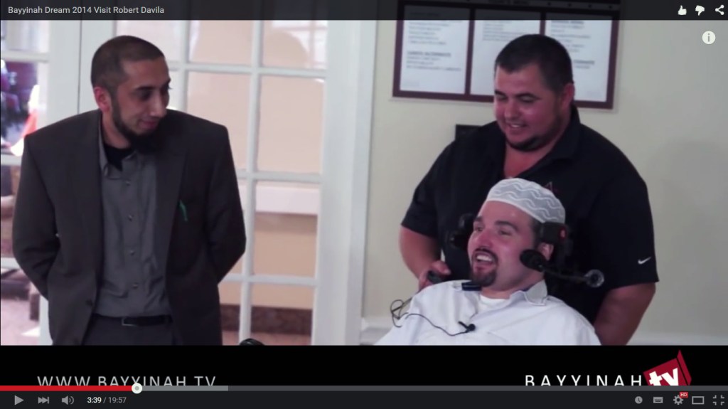 Ramadhan will end in few days. I actually have so many things to share with you, dear readers. But one thing at a time, I think. 🙂 Today, after doing my work, I was listening to some da’wah by youtube. And I will share this inspirational video with you. It’s about a man, he’s paralysed from neck down. His name is Robert Davila. The da’i is Nouman Ali Khan.