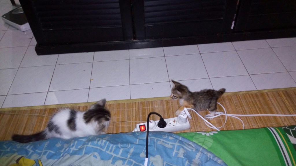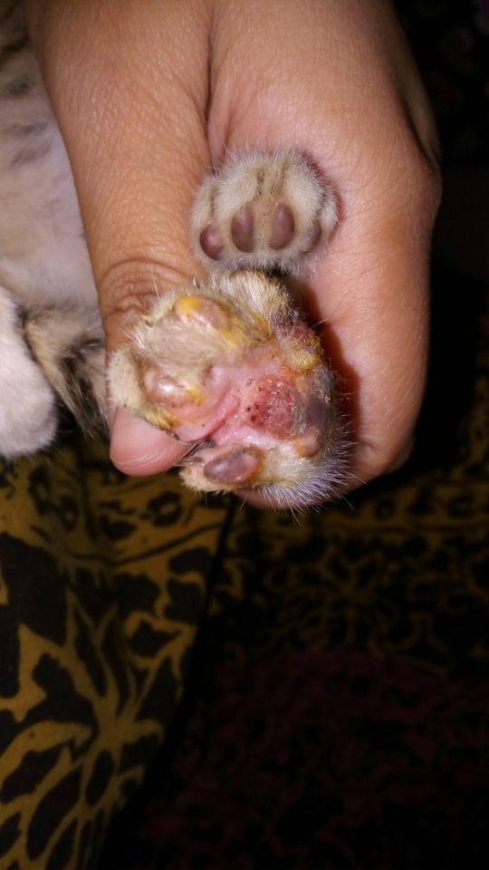 When we’re back home, this new kitten was so loudly meowing as we opened the door. I examined it–turns out, it’s a she, and found that she has this weird way of walking. I noticed her right hind foot covered in dirt. I kept a suspicion to myself. After we feed her, bathe her with warm water, cleaned up the “dirt” and dried her with a clean towel.