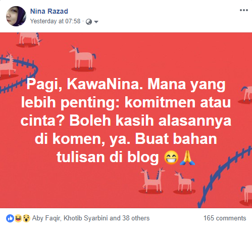 Kemarin pagi, Rabu, 21 November 2018, saya melemparkan pertanyaan di laman facebook:”Mana lebih penting, cinta atau komitmen?”