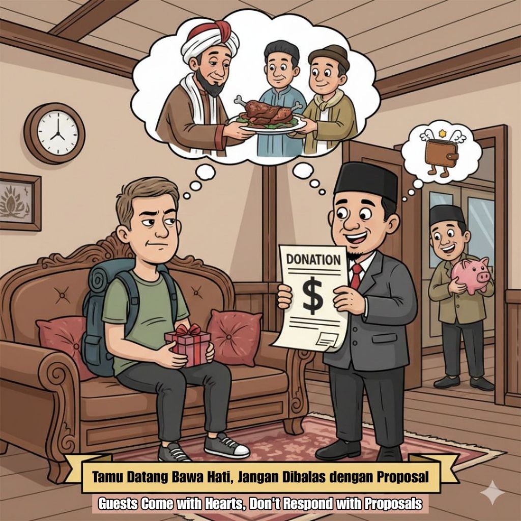 Padahal, dalam Islam, tamu itu raja yang membawa keberkahan, bukan peluang bisnis, apalagi sapi perah. Rasulullah SAW bersabda dengan sangat tegas, “Barang siapa beriman kepada Allah dan hari akhir, maka hendaklah ia memuliakan tamunya” (HR. Bukhari & Muslim). Konteks “memuliakan” (Ikramul Dhuyuf) di sini adalah melayani, memberi makan, dan memberikan rasa aman. Tidak ada riwayat yang mengajarkan kita untuk memanfaatkan rasa sungkan tamu demi kepentingan materi pribadi atau kelompok. Meminta-minta kepada tamu, apalagi yang berbeda kultur dan negara, adalah tindakan yang kontradiktif dengan semangat melayani yang diajarkan Nabi.